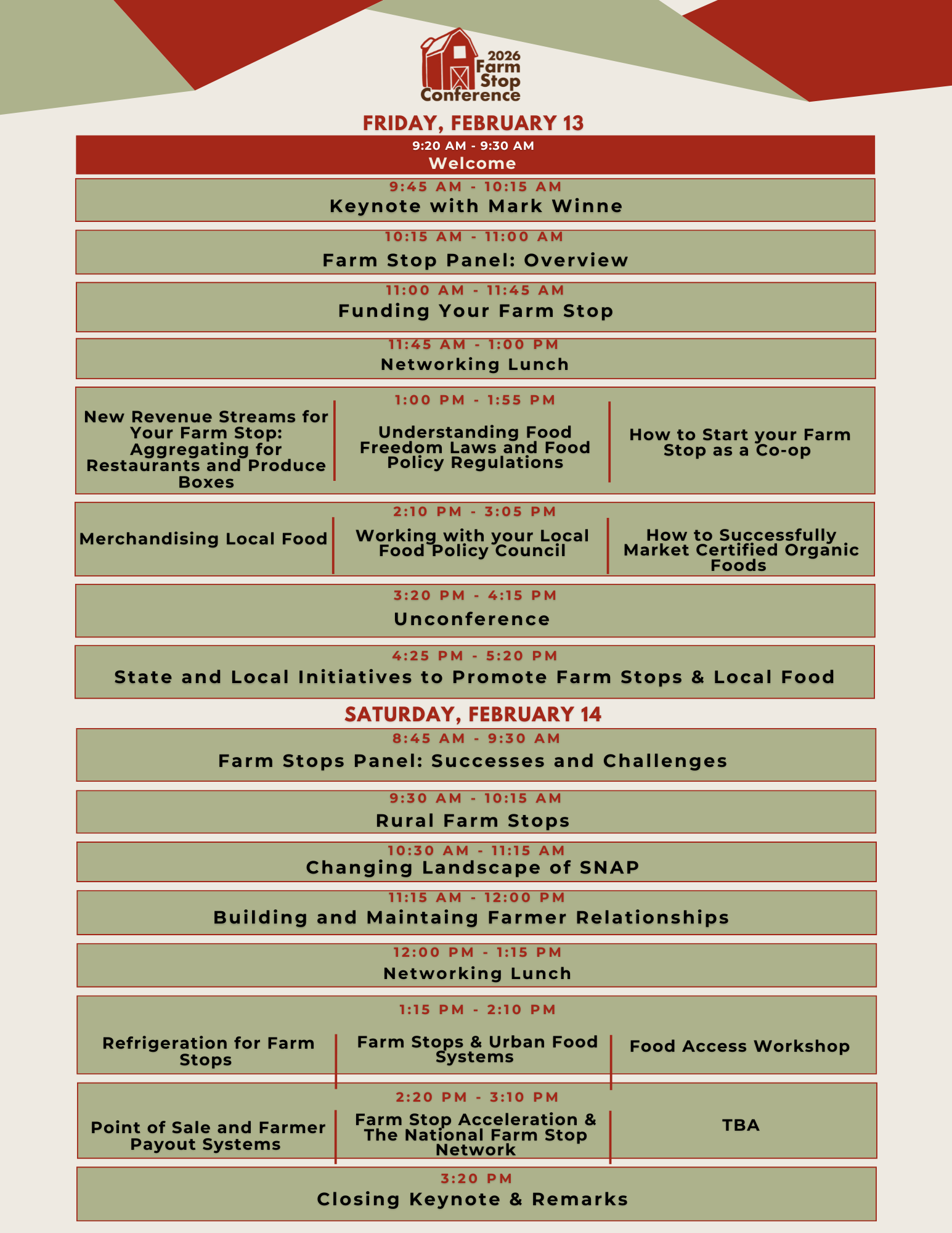 Check out the first draft of programming for the 2026 Farm Stop Conference below. Speakers and additional sessions will be announced soon, so sign up for the Farm Stop Conference newsletter below to stay up to date!