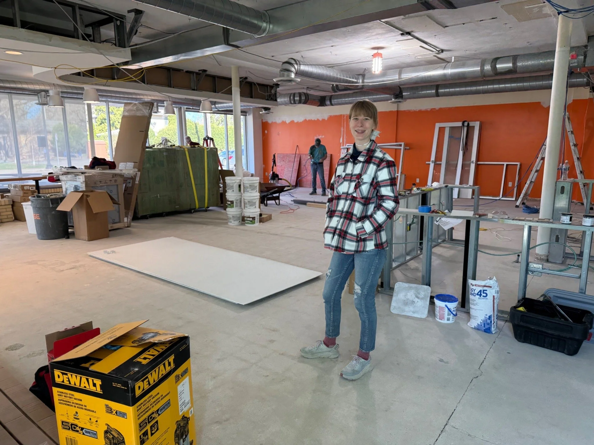 LILY: This weekend, my partner Chris and I were at the store nearly all day, both Saturday and Sunday. On Sunday, we painted the entryway door. We painted the sign, and put in the Radish Farm Stop acrylic sign in the window. It looks a lot perkier now. People were driving by, yelling out their windows about how excited they are to have us here, and asking when we're opening. Chris joked, "How can we get work done when everyone wants to talk?" It's been really great, and I'm excited for word to continue to spread. Inside the store, we have the coffee counter framed up, but the finishes won't go on until mid to late April. Plumbing is nearly done. Electrical is happening today. Some equipment will arrive on April 13th, and the refrigeration should get put in on the 16th. It mostly just looks like a torn up construction zone right now, but all of the main elements have been put in place, so it should begin to come together quickly.