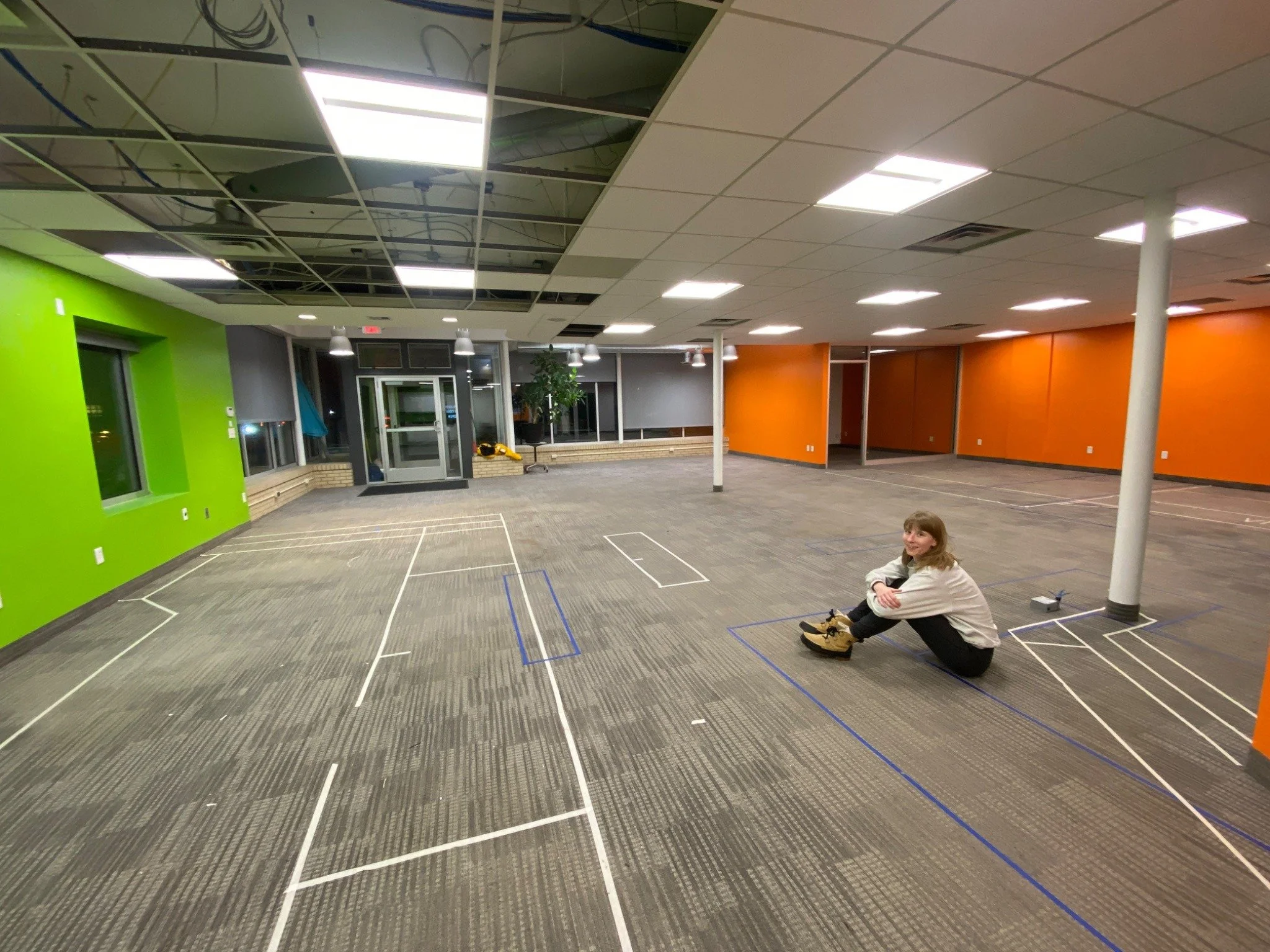 Lily at Radish Farm Stop surrounded by the taped out floor plan